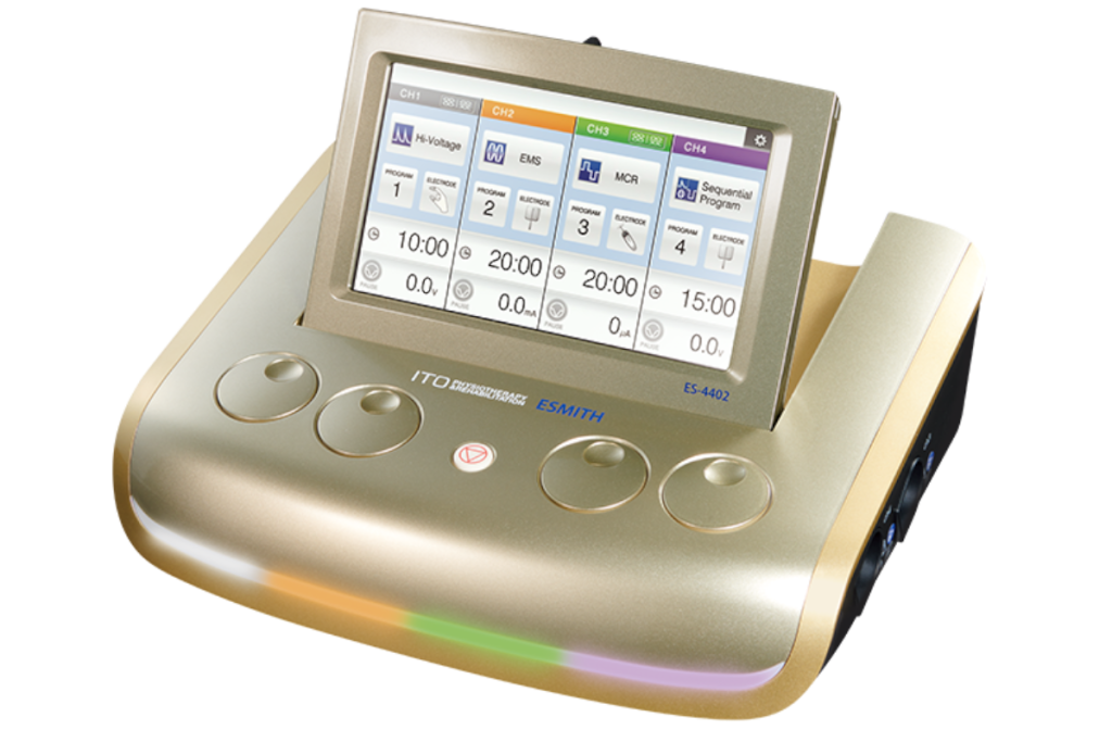 船橋本町通り接骨院では、最新のハイボルテージ治療器「エスミス ES-4402」を導入しています。この機器は、従来の電気治療では届きにくかった体の深部にある痛みの原因に、高電圧の電気刺激をピンポイントでアプローチできるのが特長です。